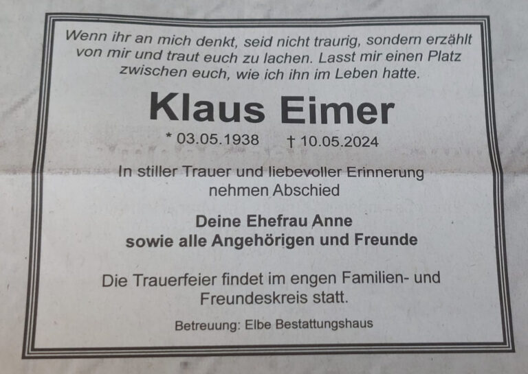 Mit tiefer Trauer geben wir den Tod unseres geschätzten Vereinskollegen Klaus Eimer bekannt. Klaus war ein Gründungsmitglied unseres Vereins, über 30 Jahre lang ein aktives Vorstandsmitglied und schließlich Ehrenmitglied. Sein Engagement, seine Weisheit und...